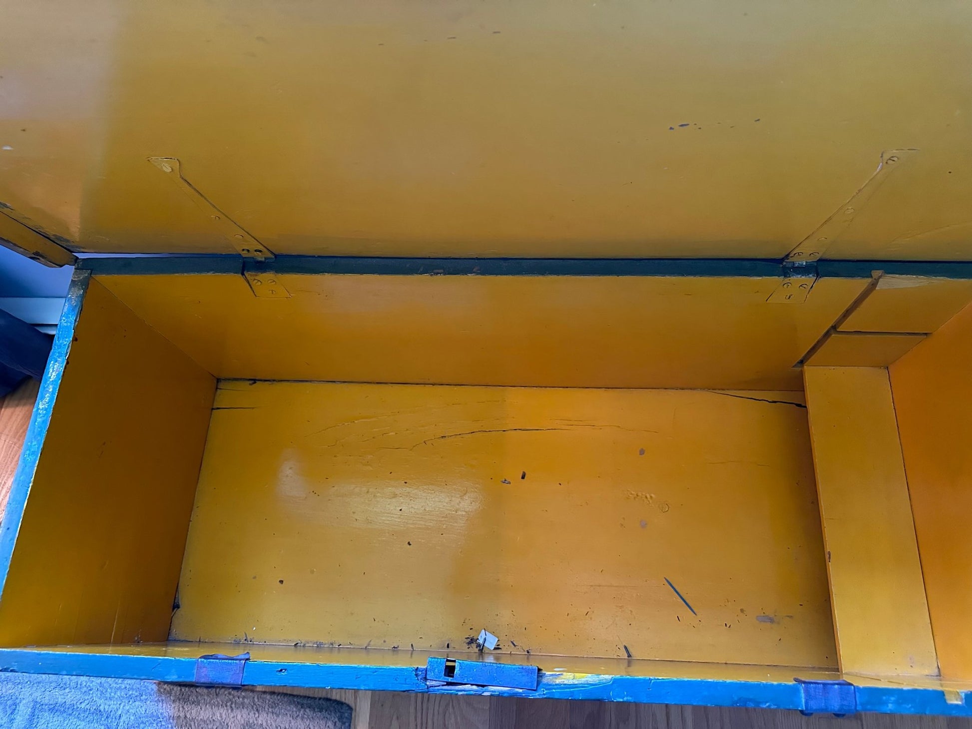 The inside is painted in a contrasting golden yellow, a hallmark of Central and Eastern European folk chests, adding a bright touch to the rustic exterior. At 43” wide, this chest is ideal as a blanket box, coffee table with hidden storage, or end-of-bed chest. Its folk-art style and original paint make it a unique and collectible piece.