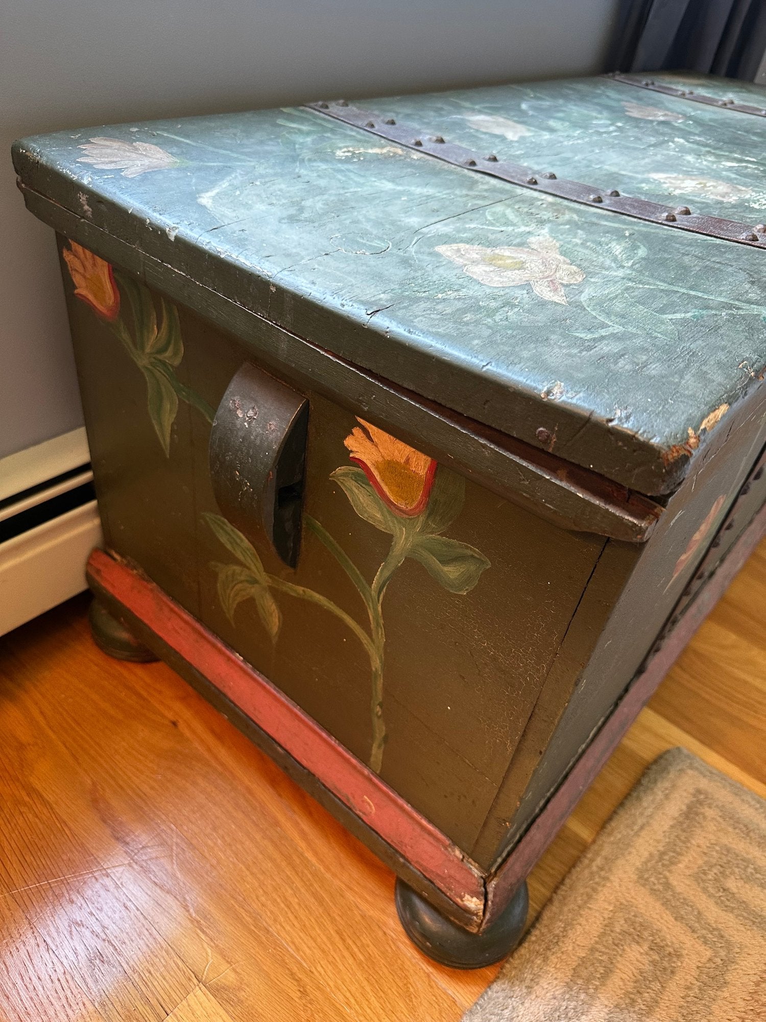 Antique Hand-Painted Green Storage Chest with Floral Motifs – Central/Eastern Europe, 43” Wide