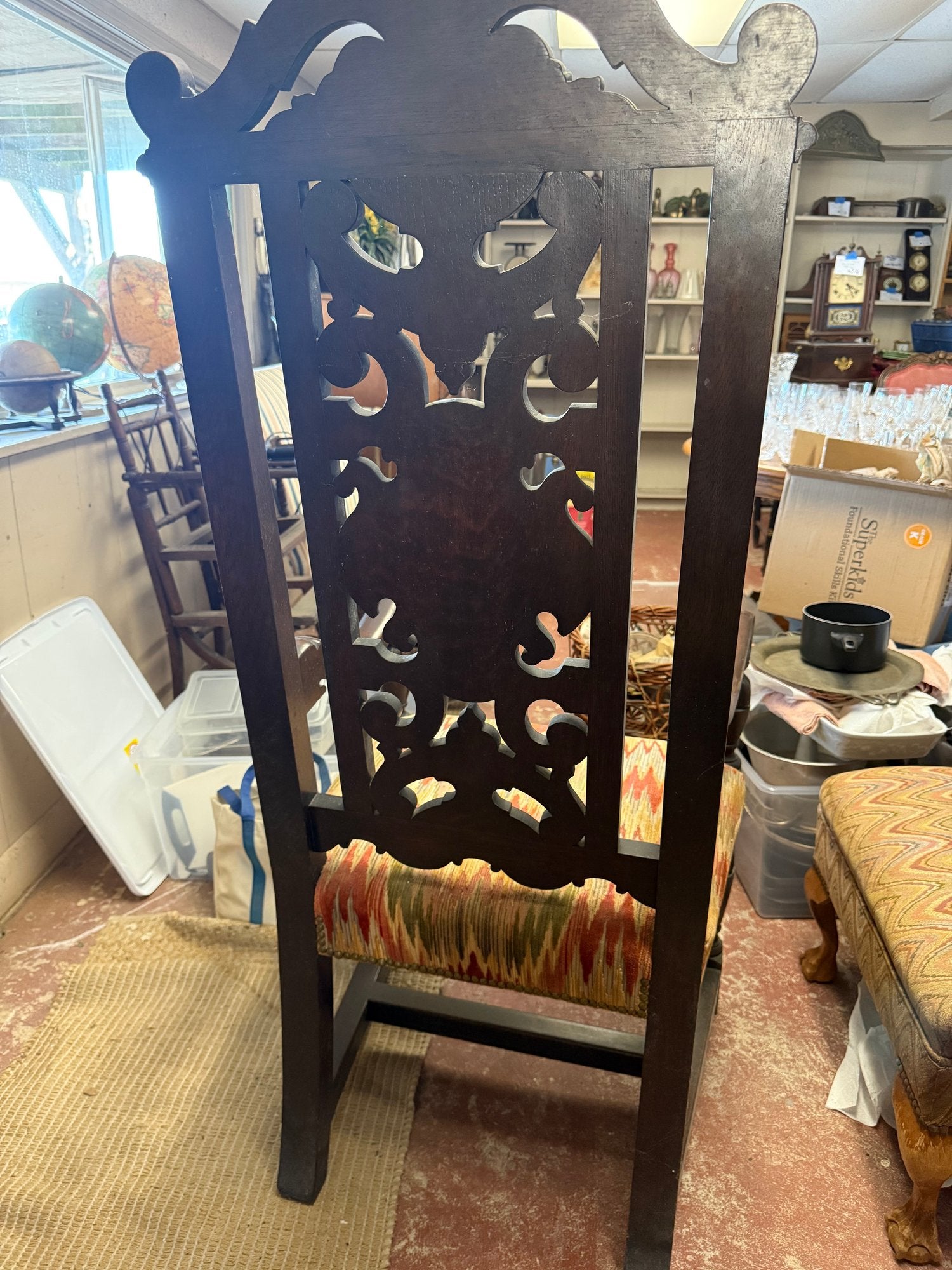 The seat has been updated with a patterned upholstered cushion in warm tones, providing comfort while preserving the chair’s decorative presence. Perfect as a statement piece in a living room, study, or entryway, this chair embodies the grandeur of Spanish and Baroque-inspired design.