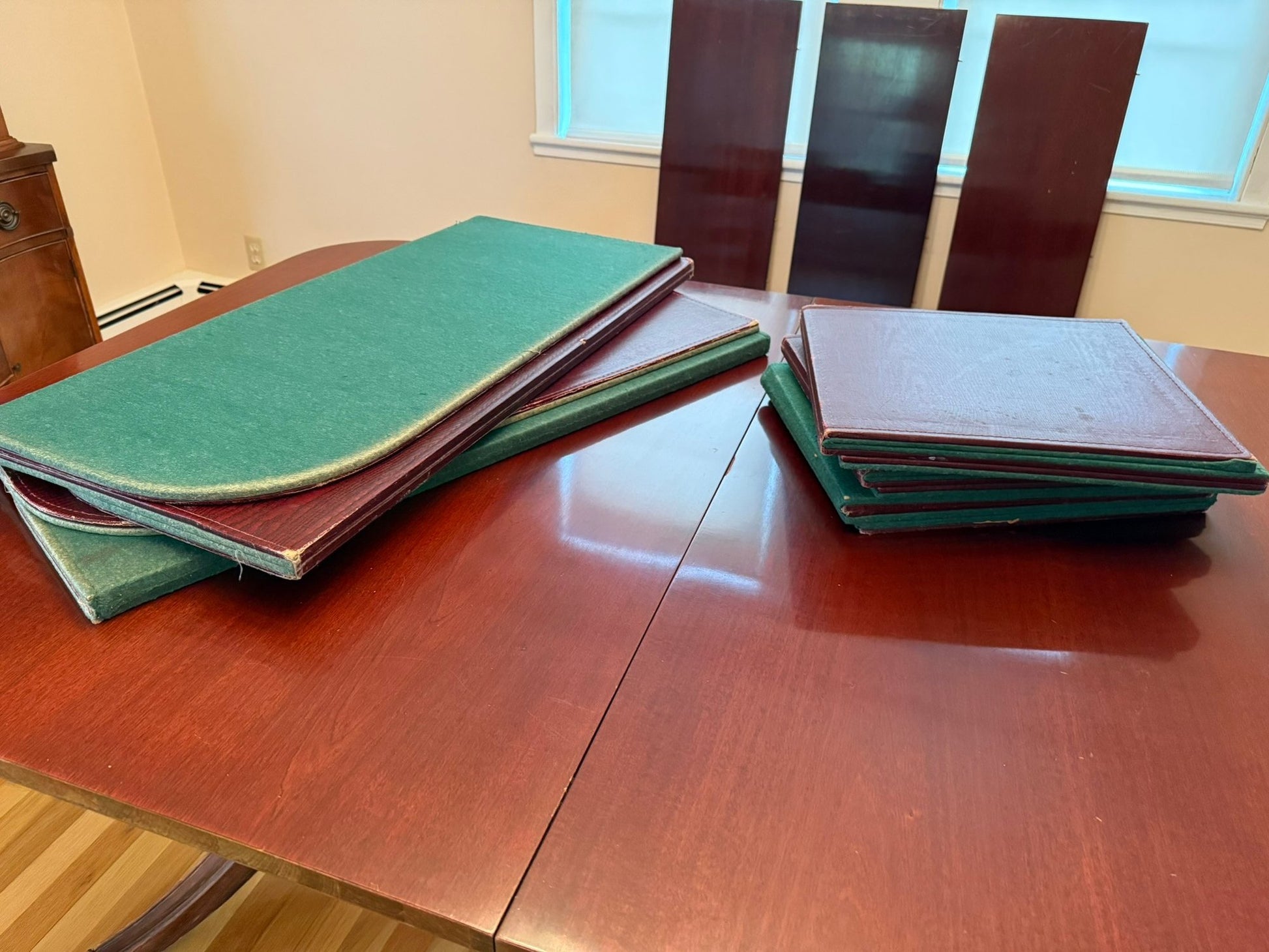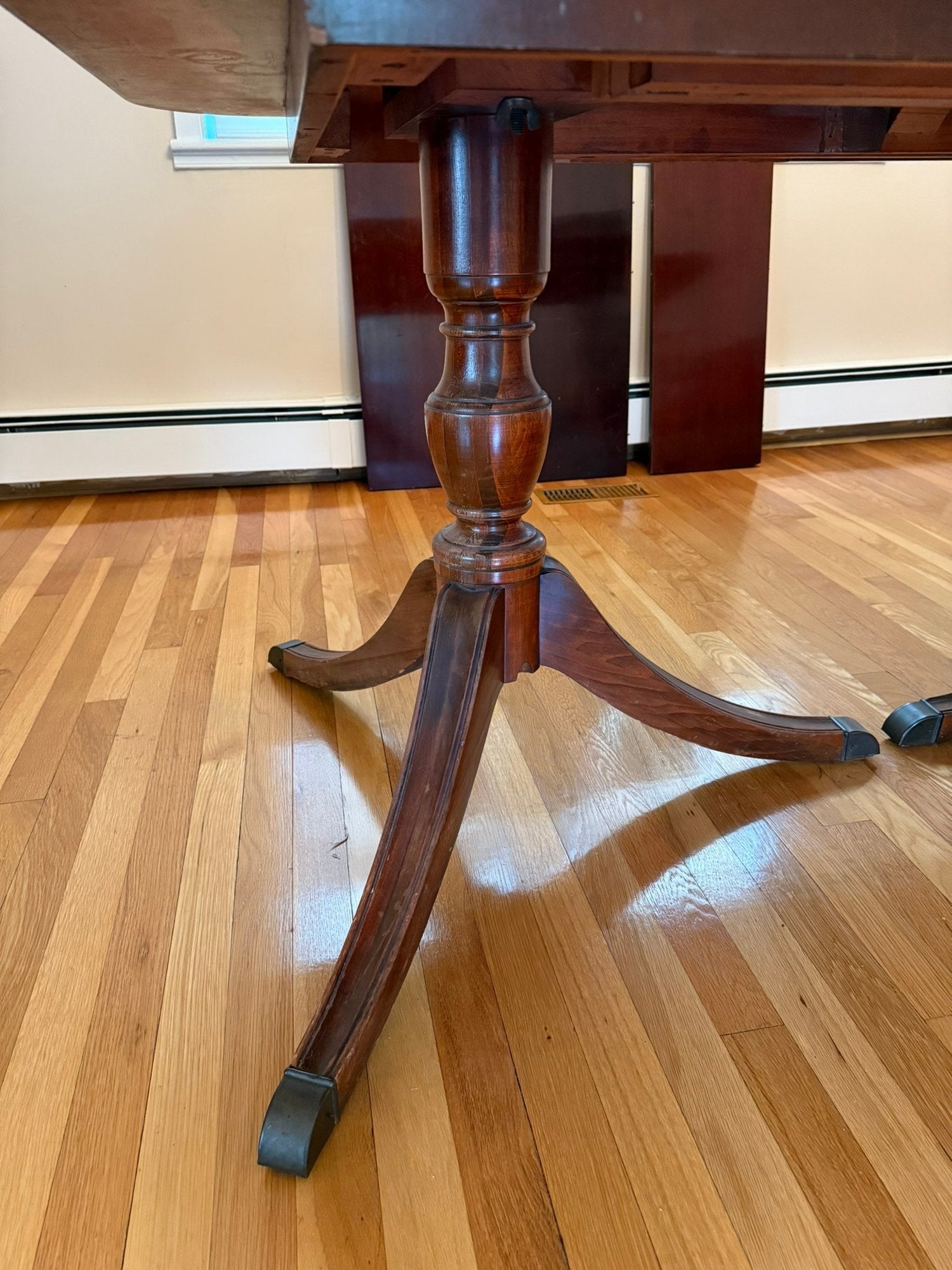 A traditional double-pedestal dining table crafted of rich mahogany, featuring brass-tipped feet and three extension leaves for added seating capacity. The set includes five custom protective pads, preserving the polished surface for decades of use.